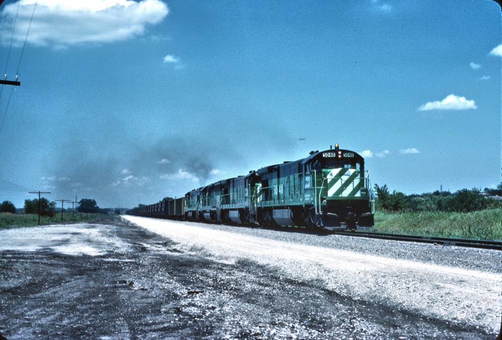 Burlington Northern C30-7 Number 5028, built March 1980; C30-7 Number unknown; SD40-2 Number unknown; U30C Number unknown; with southbound coal loads at Fort Worth, Texas on May 31, 1981. Photo by Al Christianson.
