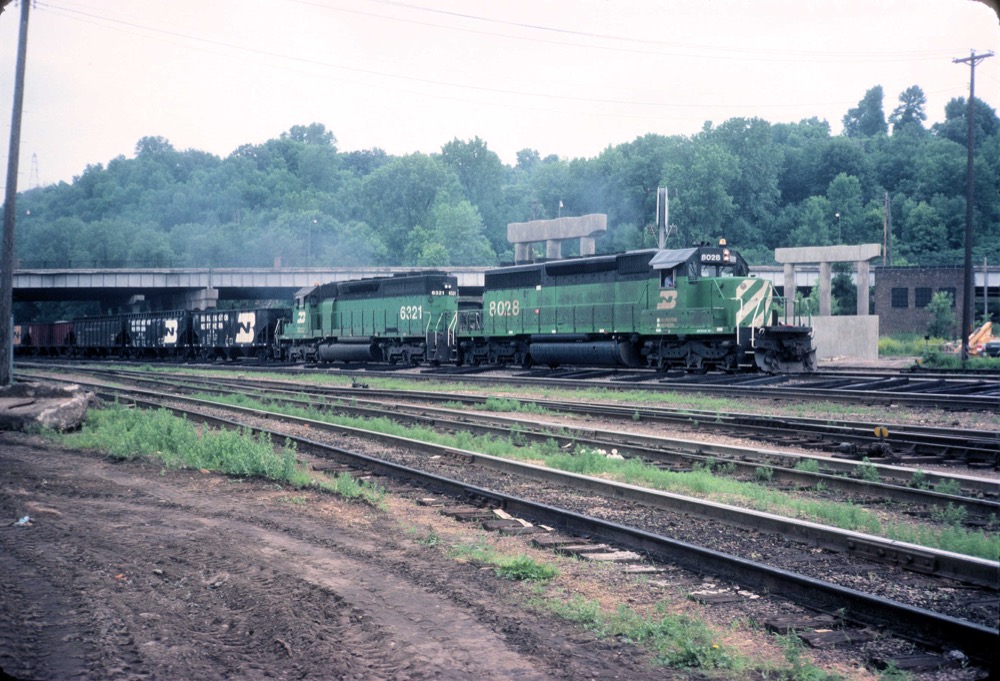 Burlington Northern Type SD40-2 Number 8028 and Type SD40 Number 6321 with coal hoppers at Saint Paul, Minnesota on June 13, 1980. Number 8028 was built by EMD March, 1978 as Builder Number 776055-39. It became BNSF Number 8028/Number 1678. Number 6321 was built by EMD February 1972 as Builder Number 5801-22. It became BNSF Number 6321. Photo by Al Christianson.