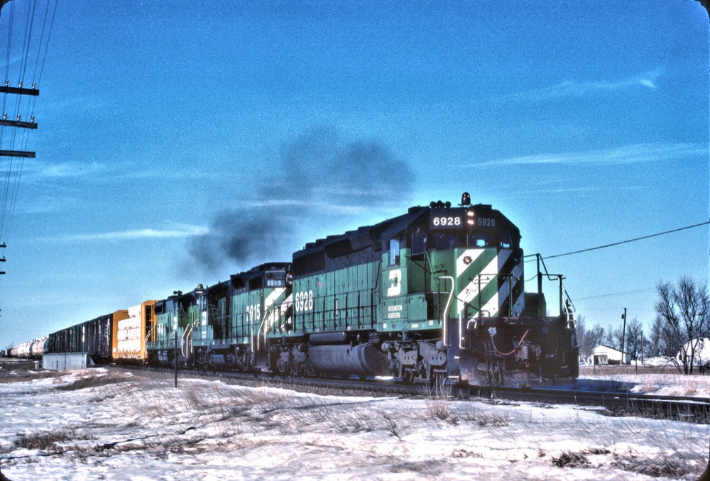 Burlington Northern SD40-2 Number 6928, built November 1973; GP20 Number 2015, former Great Northern Number 2015; SD9 , number unknown; at Moorhead, Minnesota with mixed freight on February 20, 1982. Second car behind power is former Northern Pacific 40 foot combination door boxcar. Photo by Al Christianson.