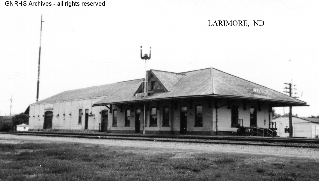 Great Northern depot at Larimore, North Dakota, undated. Photograph by Robert Johnston, from the Norm Keyes Collection.