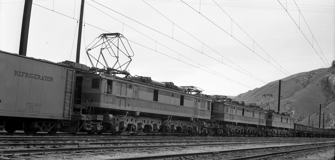 Great Northern electric locomotives 5014 and 5017, Class Y1 in Wenatchee, Washington, undated. Photograph by Wade Stevenson.