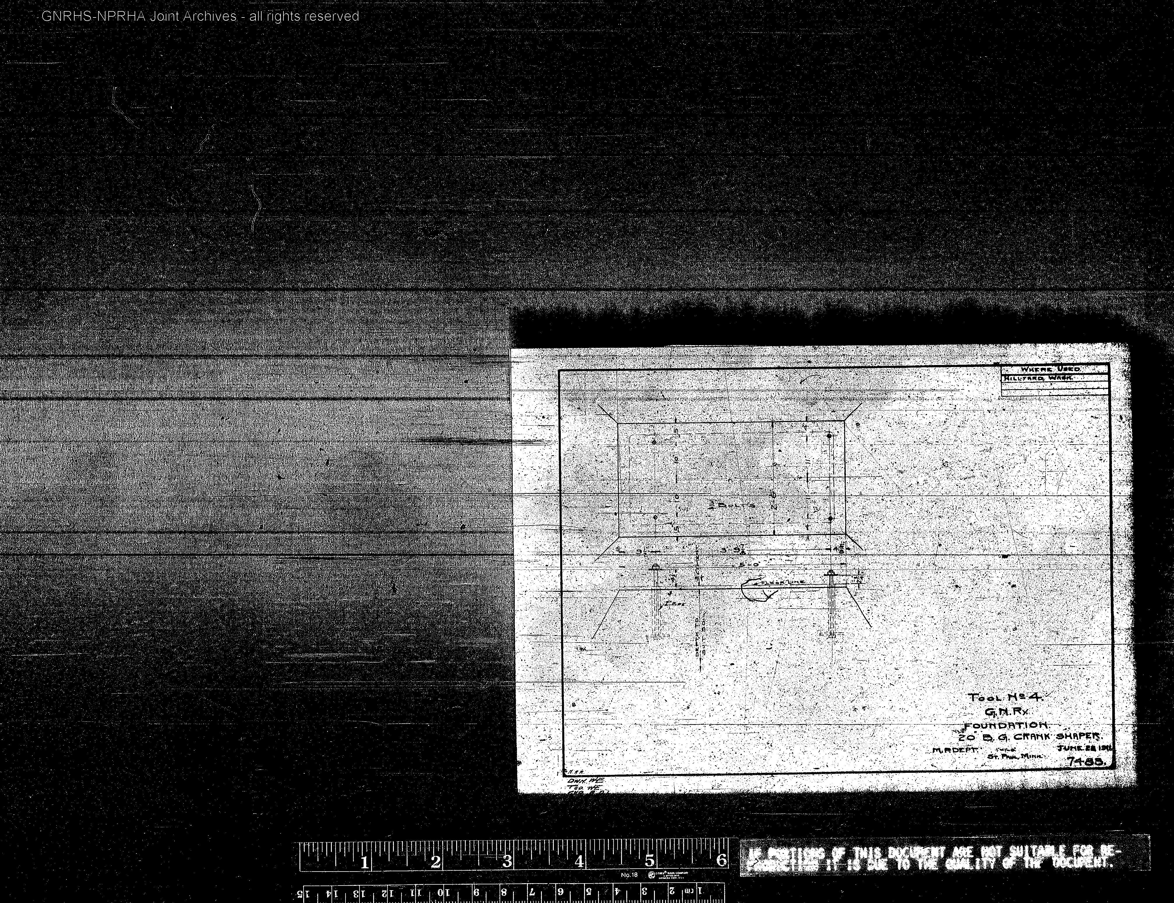 Great Northern Engineering Drawing: Roundhouse and Shops, Foundation Crank Shaper at Hillyard, Washington, prepared in 1911. Burlington Northern File Number 8138, Reference Number 10106.