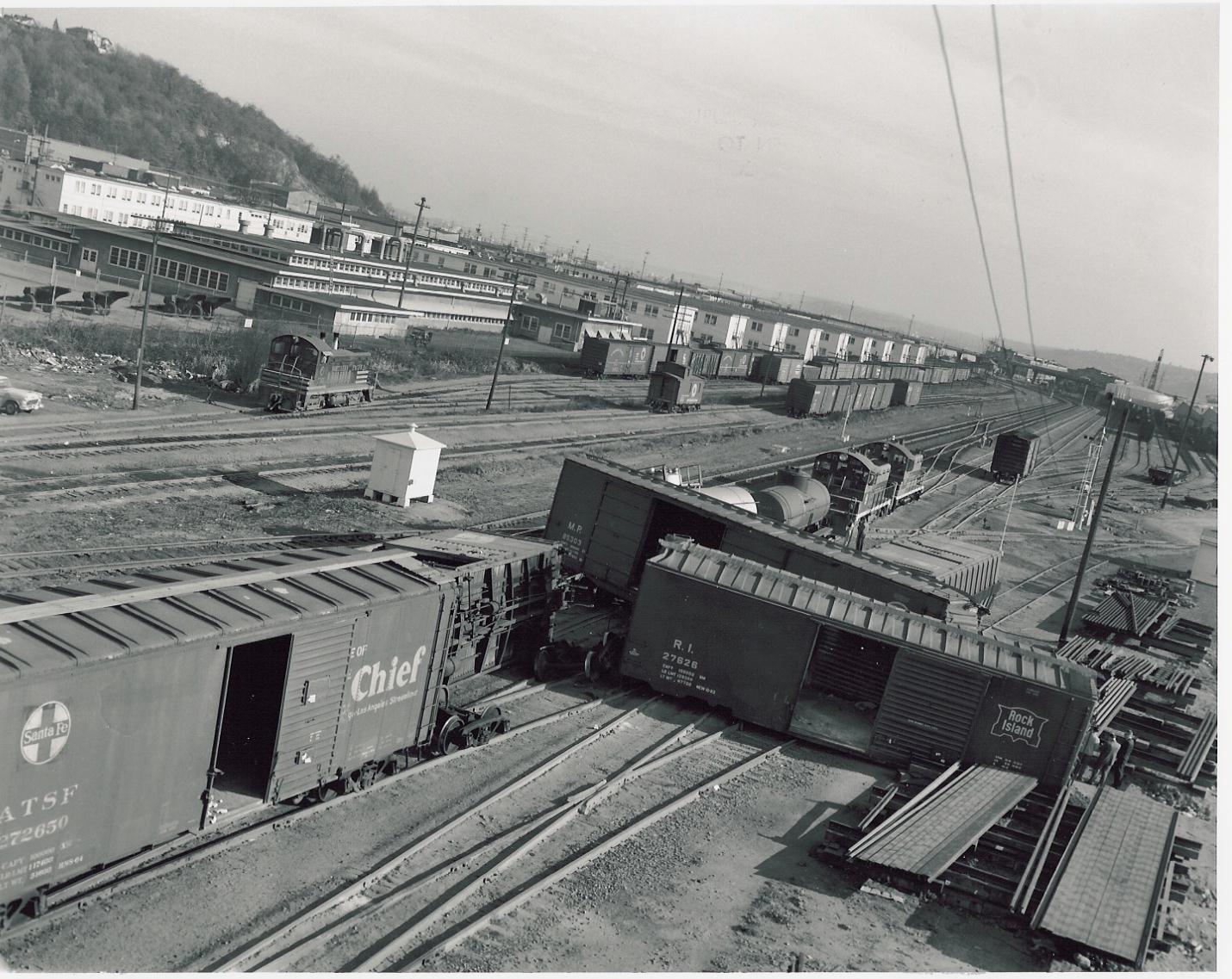 An accident on the Interbay yard south lead tracks, at "NP Crossing", the Northern Pacific tracks cross the Great Northern tracks from left-to-right to access industries and the Navy docks. A small Northern Pacific yard is at left in front of the nine white barracks buildings; a Northern Pacific semaphore is visible at right. "G yard" is in the distance. Likely taken in the mid-1960s.