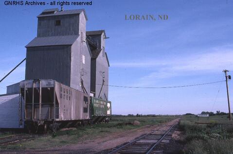 Great Northern station sign at Lorain, North Dakota, undated. Showing local elevators, photograph by Harold Hall, from the Norm Keyes Collection.