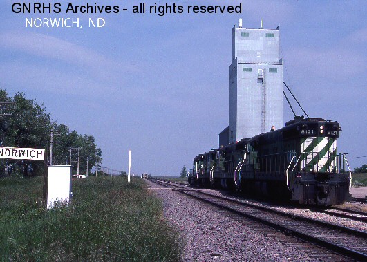 Great Northern station sign at Norwich, North Dakota, undated. Showing local elevators, photograph by Norm Keyes, from the Norm Keyes Collection.