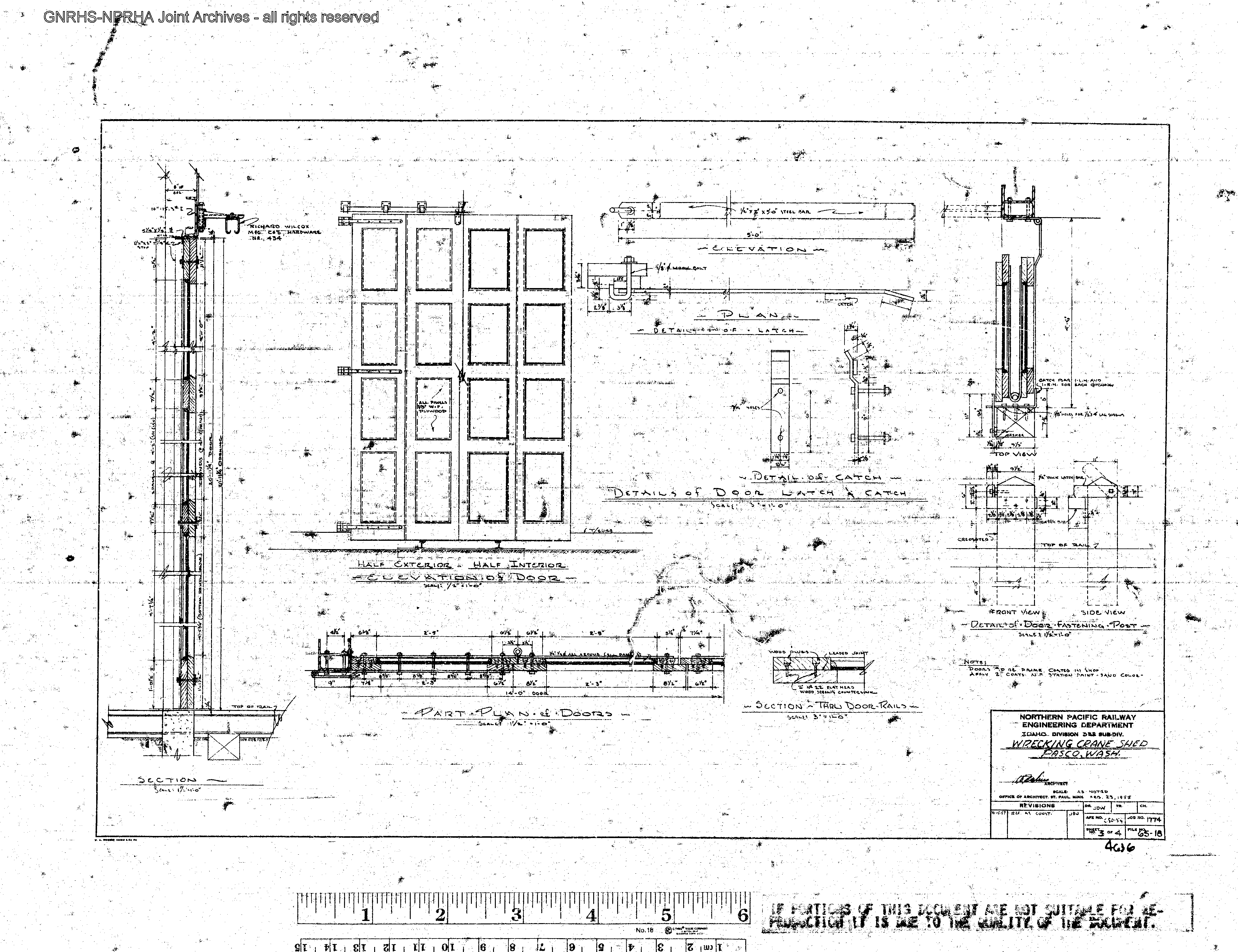 Northern Pacific Engineering Drawing: Wrecking Crane Shed at Pasco, Washington, prepared in 1957. Burlington Northern File Number 4636, Reference Number 10110, Sheet 003.