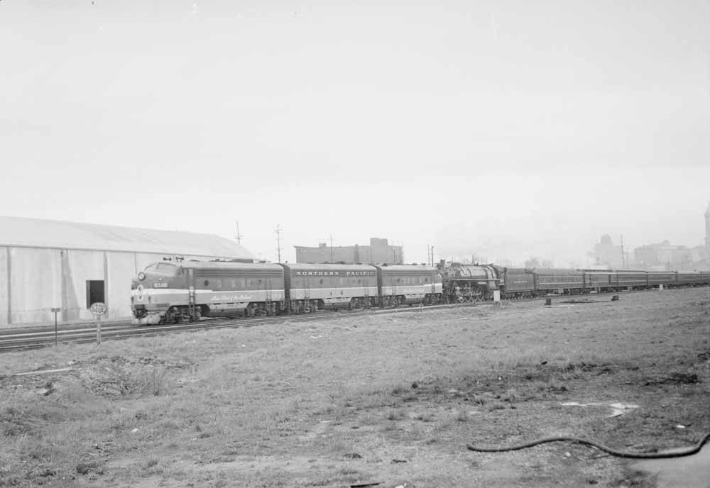 Northern Pacific passenger train number 408, Seattle-Portland, departs Seattle, Washington, circa 1953, behind an unusual power combination of diesel locomotive number 6510 followed by Class A-1 Northern-type steam locomotive number 2626. Photo by J.M. Fredrickson. Other Subject Classes: passenger train, diesel locomotive, steam locomotive