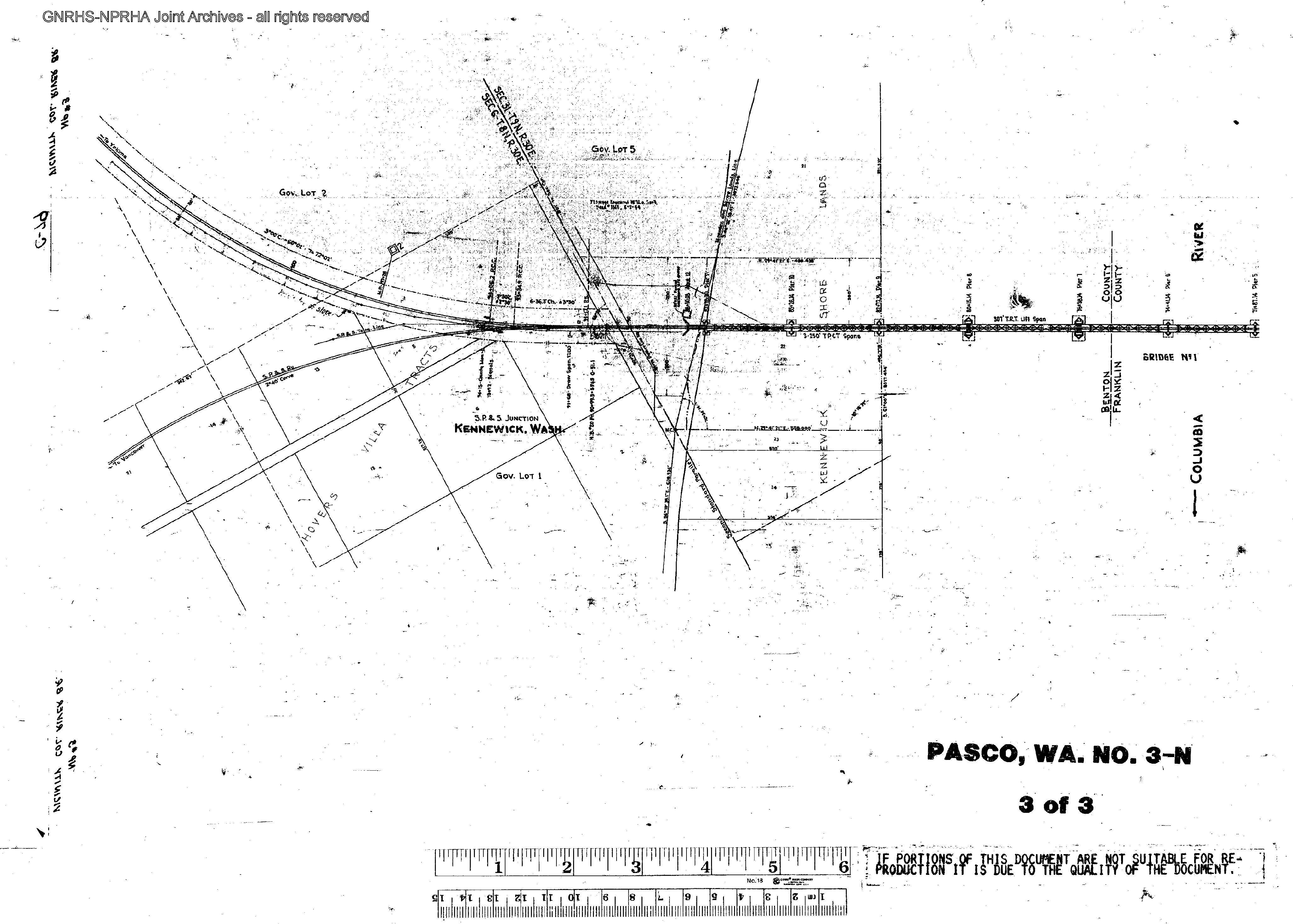 Plat Map of Northern Pacific facilities at Pasco, Washington, October 14, 1944, Sheet Number 3, Line Segment 46, 48, showing the Spokane-Pasco-Spokane, Portland, and Seattle Railway Junction line, Pasco-Ellensburg line, Kennewick Spokane, Portland, and Seattle Railway Junction.
