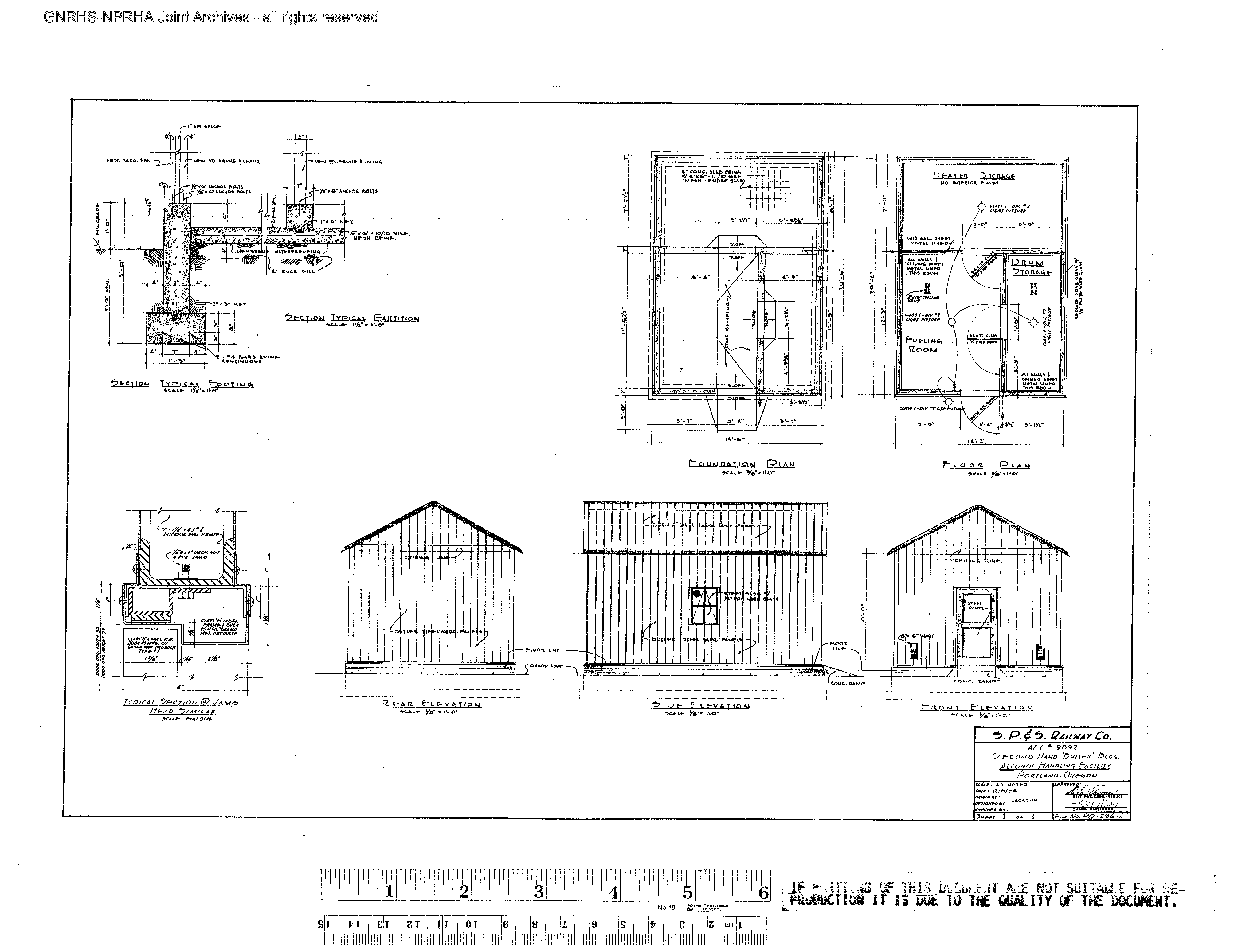 Spokane, Portland, and Seattle Railway Engineering Drawing: Alcohol Handling Facility Second-Hand Butler Building at Portland, Oregon, prepared in 1958. Burlington Northern File Number PQ-296-A, Reference Number 10112, Sheet 001.