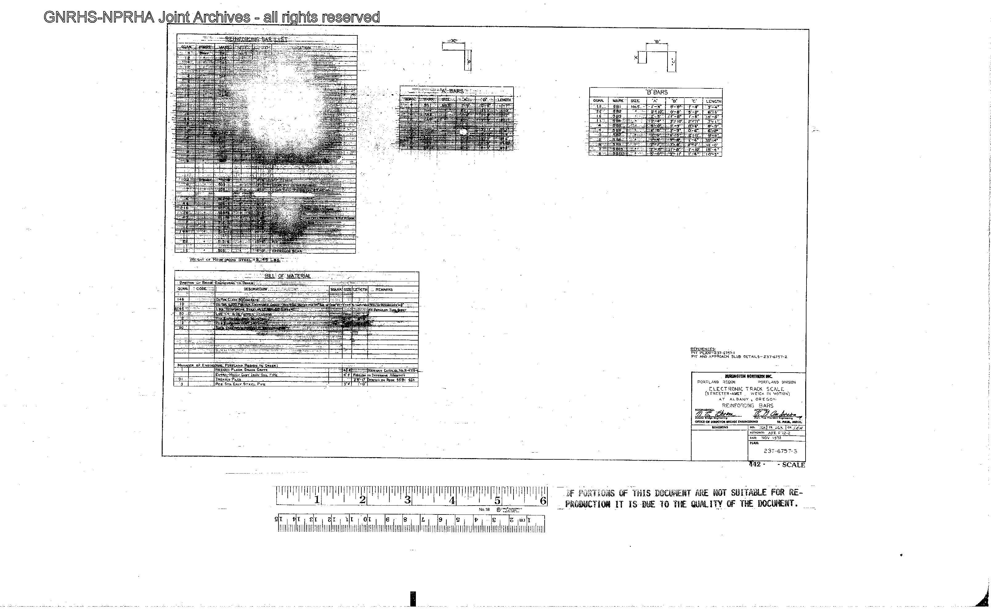 Spokane, Portland and Seattle Railway Engineering Drawing: Reinforcing Bars, Scale, Albany, Oregon, Line Segment 442. Sheet 237 - 6757 - 3, undated.